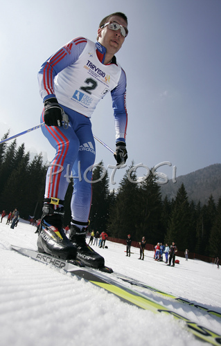 : Evgeniy Garanichev of Russia skiing in Men 4x5km relay race of Junior Nordic skiing World Championships in Tarvisio, Italy. Men 4x5km relay race of Junior Nordic skiing World Championships in Tarvisio, Italy was held on 18th of March 2007 in Fusine, Italy. Due warm weather and lack of snow, cross country skiing races of Junior Nordic skiing World Championships 2007 were moved from Tarvisio, Italy to Fusine, Italy.