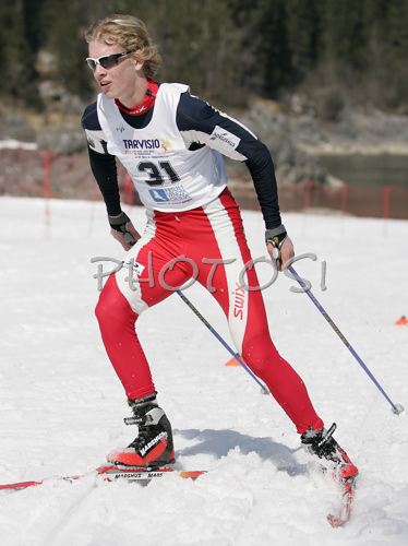 : Magnus Krog of Norway skiing in Nordic combined sprint race of Junior Nordic skiing World Championships in Tarvisio, Italy. Nordic combined sprint race of Junior Nordic skiing World Championships in Tarvisio, Italy was held on 18th of March 2007 in Fusine, Italy. Due warm weather and lack of snow, cross country skiing races of Junior Nordic skiing World Championships 2007 were moved from Tarvisio, Italy to Fusine, Italy.