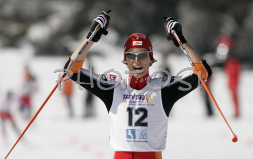 : Alfred Reiner of Austria celebrating his bronze medal in Nordic combined sprint race of Junior Nordic skiing World Championships in Tarvisio, Italy. Nordic combined sprint race of Junior Nordic skiing World Championships in Tarvisio, Italy was held on 18th of March 2007 in Fusine, Italy. Due warm weather and lack of snow, cross country skiing races of Junior Nordic skiing World Championships 2007 were moved from Tarvisio, Italy to Fusine, Italy.
