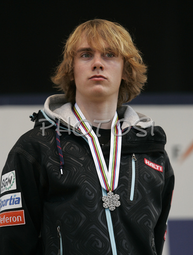 : Second placed Anssi Koivuranta of Finland celebrating his silver medal won in Nordic combined sprint race of Junior Nordic skiing World Championships in Tarvisio, Italy. Nordic combined sprint race of Junior Nordic skiing World Championships in Tarvisio, Italy was held on 18th of March 2007 in Fusine, Italy. Due warm weather and lack of snow, cross country skiing races of Junior Nordic skiing World Championships 2007 were moved from Tarvisio, Italy to Fusine, Italy.