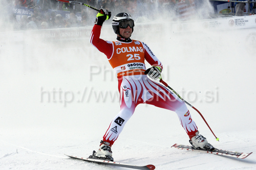 : Mario Scheiber of Austria reacts in the finish area after the mens alpine ski World Cup Downhill race in Val Gardena, Italy, Saturday, December 19, 2009.