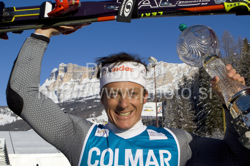 : Massimiliano Blardone of Italy celebrates in the finish area after winning the mens alpine ski World Cup Giant Slalom race in Alta Badia, Italy, Sunday, December 20, 2009.