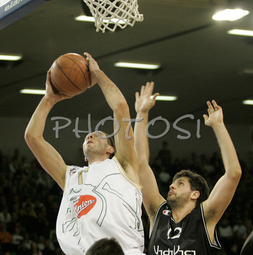 : Hasan Rizvic (no.1) of Union Olimpija (L) and Giovannoni Guilherme (no.12) of Virtus Vidivici (R) during match of 13th round of Basketball Euroleague 2007-08. Match between Union Olimpija, Ljubljana, Slovenia, and Virtus VidiVici, Bologna, Italy was played on 24th of January 2008 in Tivoli Arena in Ljubljana, Slovenia. Match was won by Union Olimpija, who defeated Virtus VidiVici with 75:60.