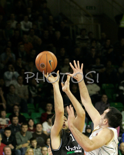 : Crosariol Andrea (no.11) of Virtus Vidivici (L) and Jasmin Hukic (no.13) of Union Olimpija (R) during match of 13th round of Basketball Euroleague 2007-08. Match between Union Olimpija, Ljubljana, Slovenia, and Virtus VidiVici, Bologna, Italy was played on 24th of January 2008 in Tivoli Arena in Ljubljana, Slovenia. Match was won by Union Olimpija, who defeated Virtus VidiVici with 75:60.