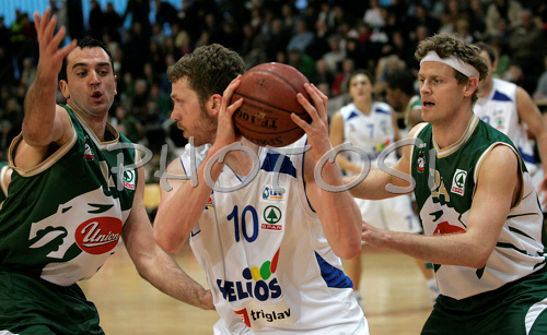 : Jack Ingram (no.10) of Helios Domzale (M) between Miha Zupan (no.24) of Union Olimpija (R) and Jasmin Hukic (no.14) of Union Olimpija (L) during final match of Spar Cup 2007-08 between Union Olimpija, Ljubljana, Slovenia, and Helios Domzale, Slovenia. Match between Union Olimpija and Helios Domzale was played on 10th of February 2008 in Arena Kodeljevo in Ljubljana, Slovenia. Match and Cup was won by Union Olimpija, who defeated Helios Domzale in final match with 85:66.
