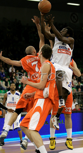 : Corey Brewer (no.31) of KK Zadar (R) shooting over Nebojsa Joksimovic (no.7) of KK Hemofarm Stada (L) during first half finals match of Basketball NLB League final four between KK Zadar, Croatia and Hemofarm Stada, Vrsac, Serbia. Match between KK Zadar and Hemofarm Stada was played on 25th of April 2008 in Tivoli Arena in Ljubljana, Slovenia. Match was won by Hemofarm Stada, who defeated KK Zadar with 81:72.