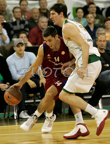 : Rodrigo De La Fuente (no.14) of Lottomatica Roma (L) during match of Basketball Euroleague between Union Olimpija, Ljubljana, Slovenia and Lottomatica Roma, Italy. Match between Union Olimpija and Lottomatica Roma was played on 6th of November 2008 in Tivoli Arena in Ljubljana, Slovenia.
