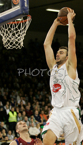 : Mirza Begic (no.15) of Union Olimpija scoring during match of Basketball Euroleague between Union Olimpija, Ljubljana, Slovenia and Lottomatica Roma, Italy. Match between Union Olimpija and Lottomatica Roma was played on 6th of November 2008 in Tivoli Arena in Ljubljana, Slovenia.