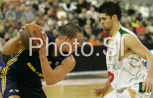 : Casey Jacobsen (no.4) of Alba Berlin (L) and Saso Ozbolt (no.31) of Union Olimpija (R) during match of Basketball Euroleague between Union Olimpija, Ljubljana, Slovenia and Alba Berlin, Germany. Match between Union Olimpija and Alba Berlin was played on 27th of November 2008 in Tivoli Arena in Ljubljana, Slovenia.
