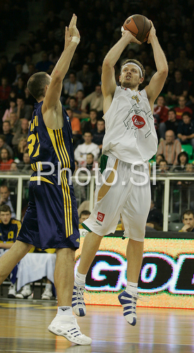 : Miha Zupan (no.24) of Union Olimpija (R) scoring over Aleksandar Nadjfeji (no.32) of Alba Berlin (L) during match of Basketball Euroleague between Union Olimpija, Ljubljana, Slovenia and Alba Berlin, Germany. Match between Union Olimpija and Alba Berlin was played on 27th of November 2008 in Tivoli Arena in Ljubljana, Slovenia.