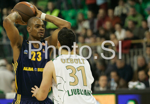 : Immanuel Mcelroy (no.23) of Alba Berlin (L) and Saso Ozbolt (no.31) of Union Olimpija (R) during match of Basketball Euroleague between Union Olimpija, Ljubljana, Slovenia and Alba Berlin, Germany. Match between Union Olimpija and Alba Berlin was played on 27th of November 2008 in Tivoli Arena in Ljubljana, Slovenia.