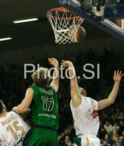 : Henk Norel (no.17) of DKV Joventut jumping for ball during match of Basketball Euroleague between Union Olimpija, Ljubljana, Slovenia and DKV Joventut, Badalona, Spain. Match between Union Olimpija and DKV Joventut was played on 4th of December 2008 in Tivoli Arena in Ljubljana, Slovenia.
