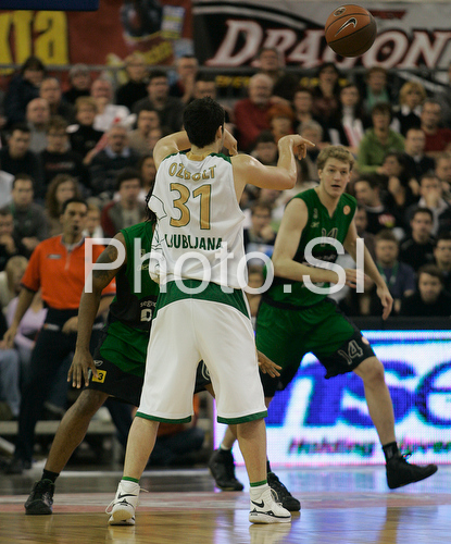 Ljubljana ,Slovenia - 04.12.2008 : Saso Ozbolt (no.31) of Union Olimpija passing the ball during match of Basketball Euroleague between Union Olimpija, Ljubljana, Slovenia and DKV Joventut, Badalona, Spain. Match between Union Olimpija and DKV Joventut was played on 4th of December 2008 in Tivoli Arena in Ljubljana, Slovenia. Photo by: Primoz Jeroncic