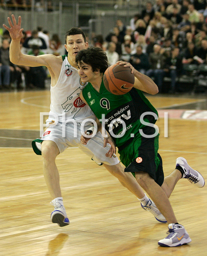 : Ricky Rubio (no.9) of DKV Joventut (R) and Vlado Ilievski (no.6) of Union Olimpija (L) during match of Basketball Euroleague between Union Olimpija, Ljubljana, Slovenia and DKV Joventut, Badalona, Spain. Match between Union Olimpija and DKV Joventut was played on 4th of December 2008 in Tivoli Arena in Ljubljana, Slovenia.