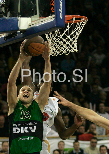 Ljubljana ,Slovenia - 04.12.2008 : Ferran Lavina (no.18) of DKV Joventut trying to score during match of Basketball Euroleague between Union Olimpija, Ljubljana, Slovenia and DKV Joventut, Badalona, Spain. Match between Union Olimpija and DKV Joventut was played on 4th of December 2008 in Tivoli Arena in Ljubljana, Slovenia. Photo by: Primoz Jeroncic