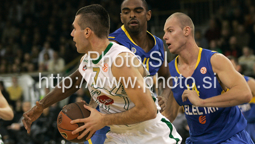 : Sani Becirovic (no.7) of Union Olimpija (L) and Maciej Lampe (no.14) of Maccabi Electra (R) during match of Basketball Euroleague between Union Olimpija, Ljubljana, Slovenia and Maccabi Electra, Tel Aviv, Israel. Match between Union Olimpija and Maccabi Electra was played on 3rd of December 2009 in Tivoli Arena in Ljubljana, Slovenia.