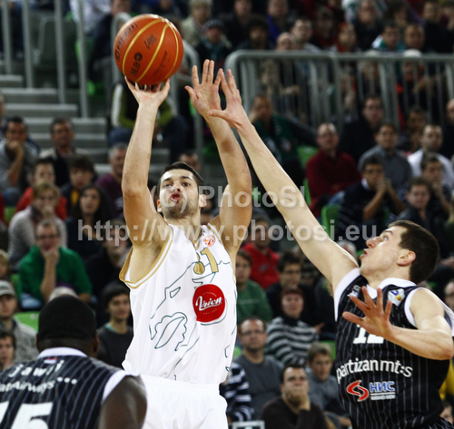 : Saso Ozbolt (no.31) of Union Olimpija (M) shooting between Dragan Milosavljevic (no.12) of Partizan mts (R) and Nathan Jawai (no.15) of Partizan mts (L) during match of NLB Adriatic basketball League between Union Olimpija and Partizan. Match of NLB Adriatic basketball League between Union Olimpija, Ljubljana, Slovenia and Partizan, Belgrade, Serbia was played in Stozice Arena, Ljubljana, Slovenia, on Sunday, 31st of October 2010.