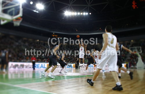 : Saso Ozbolt (no.31) of Union Olimpija shooting during match of NLB Adriatic basketball League between Union Olimpija and Partizan. Match of NLB Adriatic basketball League between Union Olimpija, Ljubljana, Slovenia and Partizan, Belgrade, Serbia was played in Stozice Arena, Ljubljana, Slovenia, on Sunday, 31st of October 2010.