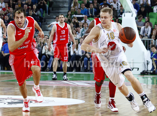 Ljubljana ,Slovenia - 02.12.2010 : Sasu Salin (no.10) of Union Olimpija (R) and Stefano Mancinelli (no.6) of Armani Jeans Milano (L) during Euroleague basketball match of 7th round between Union Olimpija and Armani jeans Milano. Match between Union Olimpija, Ljubljana, Slovenia, and Armani jeans Milano, Italy, was played in Stozice arena in Ljubljana, Slovenia, on Thursday, 2nd of December 2010. Photo by: Primoz Jeroncic