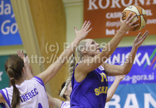 : Louice Halvarsson (no.14) of Sweden (R) and Tina Trebec (no.11) of Slovenia (L) during Women FIBA Basketball Division B group A match between Slovenia and Sweden. Match of 4th round of Women FIBA Basketball Division B group A competition was played in Vitranc Arena in Kranjska Gora, Slovenia, on 5th od June 2011.
