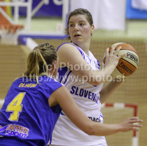 : Lea Jagodic (no.12) of Slovenia (R) and Josefin Olheim (no.4) of Sweden (L) during Women FIBA Basketball Division B group A match between Slovenia and Sweden. Match of 4th round of Women FIBA Basketball Division B group A competition was played in Vitranc Arena in Kranjska Gora, Slovenia, on 5th od June 2011.