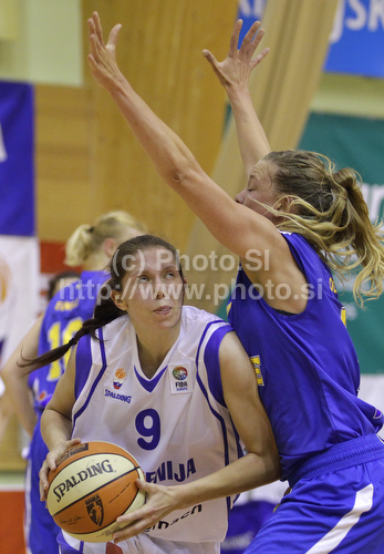 Kranjska Gora ,Slovenia - 05.06.2011 : Eva Komplet (no.9) of Slovenia (L) and Josefin Olheim (no.4) of Sweden (R) during Women FIBA Basketball Division B group A match between Slovenia and Sweden. Match of 4th round of Women FIBA Basketball Division B group A competition was played in Vitranc Arena in Kranjska Gora, Slovenia, on 5th od June 2011. Photo by: Primoz Jeroncic