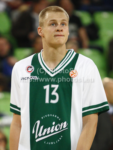 : Sasu Salin (no.13) of Union Olimpija warming up before match of 7th round of Turkish Airlines Basketball Euroleague between Union Olimpija, Ljubljana, Slovenia and Montepaschi Siena, Italy. Match of Turkish Airlines Basketball Euroleague between Union Olimpija and Montepaschi Siena was played in Stozice Arena, Ljubljana, Slovenia, on Thursday, 1st of December 2011.