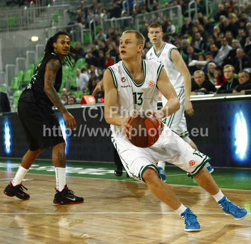 : Sasu Salin (no.13) of Union Olimpija during match of 7th round of Turkish Airlines Basketball Euroleague between Union Olimpija, Ljubljana, Slovenia and Montepaschi Siena, Italy. Match of Turkish Airlines Basketball Euroleague between Union Olimpija and Montepaschi Siena was played in Stozice Arena, Ljubljana, Slovenia, on Thursday, 1st of December 2011.