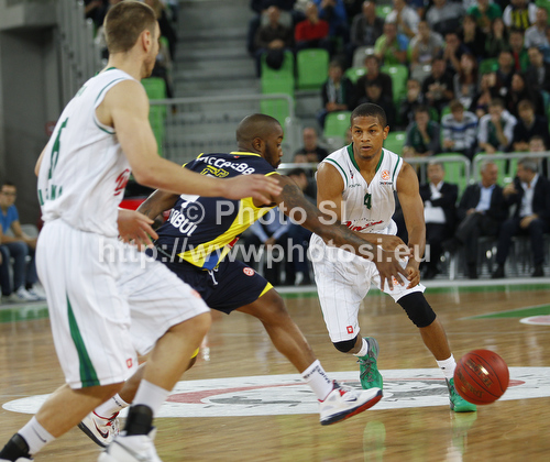 : Dominic Waters (no.4) of Union Olimpija (R) and Bo McCalebb (no.4) of Fenerbahce Ulker (L) during Turkish Airlines Euroleague basketball match of second round between Union Olimpija, Ljubljana, Slovenia and Fenerbahce Ulker, Istanbul, Turkey. Match between Union Olimpija and Fenerbahce Ulker was played in in Stozice Arena in Ljubljana, Slovenia, on Friday, 19th of October 2012.