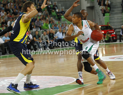 : Dominic Waters (no.4) of Union Olimpija (R) and Bo McCalebb (no.4) of Fenerbahce Ulker (back) and David Andersen (no.13) of Fenerbahce Ulker (L) during Turkish Airlines Euroleague basketball match of second round between Union Olimpija, Ljubljana, Slovenia and Fenerbahce Ulker, Istanbul, Turkey. Match between Union Olimpija and Fenerbahce Ulker was played in in Stozice Arena in Ljubljana, Slovenia, on Friday, 19th of October 2012.