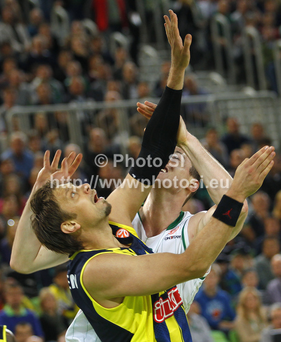 : David Andersen (no.13) of Fenerbahce Ulker (front) and Dino Muric (no.11) of Union Olimpija (back) during Turkish Airlines Euroleague basketball match of second round between Union Olimpija, Ljubljana, Slovenia and Fenerbahce Ulker, Istanbul, Turkey. Match between Union Olimpija and Fenerbahce Ulker was played in in Stozice Arena in Ljubljana, Slovenia, on Friday, 19th of October 2012.