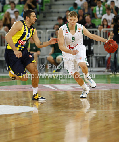 : Teemu Rannikko (no.9) of Union Olimpija (R) and Baris Ermis (no.9) of Fenerbahce Ulker (L) during Turkish Airlines Euroleague basketball match of second round between Union Olimpija, Ljubljana, Slovenia and Fenerbahce Ulker, Istanbul, Turkey. Match between Union Olimpija and Fenerbahce Ulker was played in in Stozice Arena in Ljubljana, Slovenia, on Friday, 19th of October 2012.