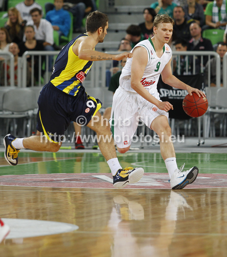 : Teemu Rannikko (no.9) of Union Olimpija (R) and Baris Ermis (no.9) of Fenerbahce Ulker (L) during Turkish Airlines Euroleague basketball match of second round between Union Olimpija, Ljubljana, Slovenia and Fenerbahce Ulker, Istanbul, Turkey. Match between Union Olimpija and Fenerbahce Ulker was played in in Stozice Arena in Ljubljana, Slovenia, on Friday, 19th of October 2012.