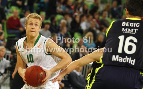 : Sasu Salin (no.10) of Union Olimpija during Turkish Airlines Euroleague basketball match of fifth round between Union Olimpija, Ljubljana, Slovenia and Real Madrid, Spain. Match between Union Olimpija and Real Madrid was played in in Stozice Arena in Ljubljana, Slovenia, on Friday, 9th of November 2012.