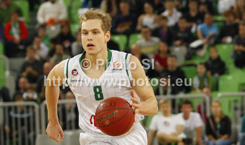 : Jaka Blazic (no.8) of Union Olimpija during Turkish Airlines Euroleague basketball match of fifth round between Union Olimpija, Ljubljana, Slovenia and Real Madrid, Spain. Match between Union Olimpija and Real Madrid was played in in Stozice Arena in Ljubljana, Slovenia, on Friday, 9th of November 2012.