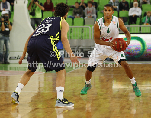 : Dominic Waters (no.4) of Union Olimpija (R) and Sergio Llull (no.23) of Real Madrid (L) during Turkish Airlines Euroleague basketball match of fifth round between Union Olimpija, Ljubljana, Slovenia and Real Madrid, Spain. Match between Union Olimpija and Real Madrid was played in in Stozice Arena in Ljubljana, Slovenia, on Friday, 9th of November 2012.