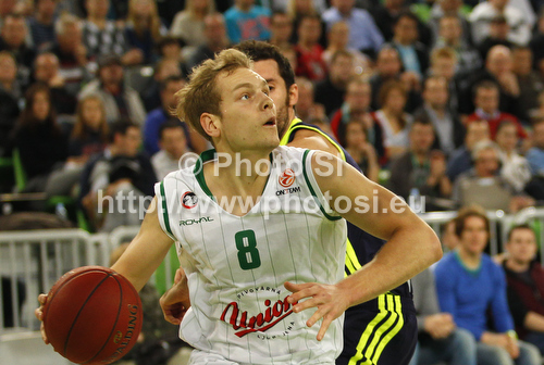 : Jaka Blazic (no.8) of Union Olimpija during Turkish Airlines Euroleague basketball match of fifth round between Union Olimpija, Ljubljana, Slovenia and Real Madrid, Spain. Match between Union Olimpija and Real Madrid was played in in Stozice Arena in Ljubljana, Slovenia, on Friday, 9th of November 2012.