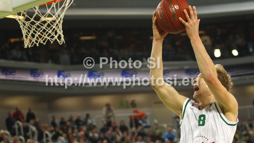 : Jaka Blazic (no.8) of Union Olimpija during Turkish Airlines Euroleague basketball match of fifth round between Union Olimpija, Ljubljana, Slovenia and Real Madrid, Spain. Match between Union Olimpija and Real Madrid was played in in Stozice Arena in Ljubljana, Slovenia, on Friday, 9th of November 2012.