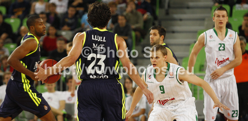 : Teemu Rannikko (no.9) of Union Olimpija (R) playing defense against Sergio Llull (no.23) of Real Madrid (L) during Turkish Airlines Euroleague basketball match of fifth round between Union Olimpija, Ljubljana, Slovenia and Real Madrid, Spain. Match between Union Olimpija and Real Madrid was played in in Stozice Arena in Ljubljana, Slovenia, on Friday, 9th of November 2012.