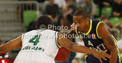 : Dontaye Draper (no.4) of Real Madrid (R) and Dominic Waters (no.4) of Union Olimpija (L) during Turkish Airlines Euroleague basketball match of fifth round between Union Olimpija, Ljubljana, Slovenia and Real Madrid, Spain. Match between Union Olimpija and Real Madrid was played in in Stozice Arena in Ljubljana, Slovenia, on Friday, 9th of November 2012.
