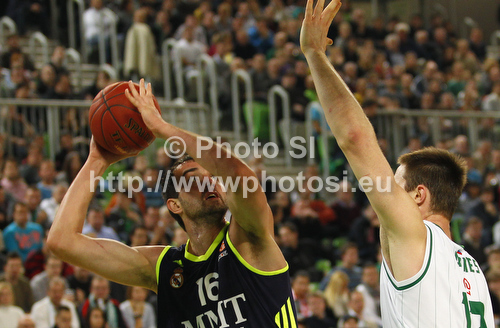 : Mirza Begic (no.16) of Real Madrid (L) and Aron Baynes (no.12) of Union Olimpija (L) during Turkish Airlines Euroleague basketball match of fifth round between Union Olimpija, Ljubljana, Slovenia and Real Madrid, Spain. Match between Union Olimpija and Real Madrid was played in in Stozice Arena in Ljubljana, Slovenia, on Friday, 9th of November 2012.