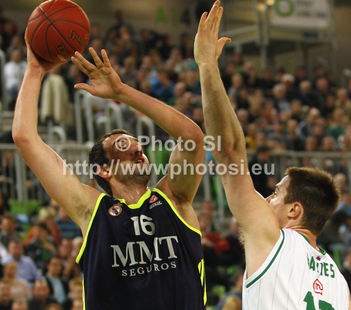 : Mirza Begic (no.16) of Real Madrid (L) and Aron Baynes (no.12) of Union Olimpija (L) during Turkish Airlines Euroleague basketball match of fifth round between Union Olimpija, Ljubljana, Slovenia and Real Madrid, Spain. Match between Union Olimpija and Real Madrid was played in in Stozice Arena in Ljubljana, Slovenia, on Friday, 9th of November 2012.