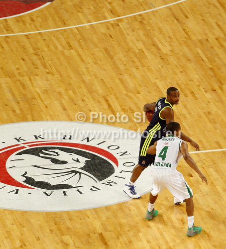 : Dontaye Draper (no.4) of Real Madrid and Dominic Waters (no.4) of Union Olimpija during Turkish Airlines Euroleague basketball match of fifth round between Union Olimpija, Ljubljana, Slovenia and Real Madrid, Spain. Match between Union Olimpija and Real Madrid was played in in Stozice Arena in Ljubljana, Slovenia, on Friday, 9th of November 2012.