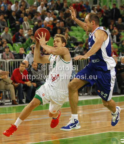 : Jaka Blazic (no.8) of Union Olimpija (L) and Marco Cusin (no.22) of Mapooro Cantu (R) during Turkish Airlines Euroleague basketball match of sixth round between Union Olimpija, Ljubljana, Slovenia and Mapooro Cantu, Italy. Match between Union Olimpija and Mapooro Cantu was played in in Stozice Arena in Ljubljana, Slovenia, on Thursday, 15th of November 2012.