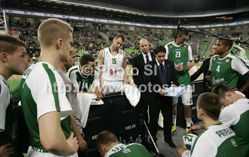 : Team of Union Olimpija gathered together before start of Turkish Airlines Euroleague basketball match of sixth round between Union Olimpija, Ljubljana, Slovenia and Mapooro Cantu, Italy. Match between Union Olimpija and Mapooro Cantu was played in in Stozice Arena in Ljubljana, Slovenia, on Thursday, 15th of November 2012.