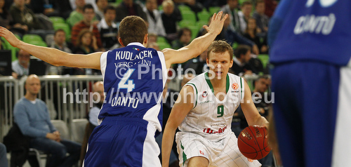 : Teemu Rannikko (no.9) of Union Olimpija (R) and JJakub Kudlacek (no.4) of Mapooro Cantu (L) during Turkish Airlines Euroleague basketball match of sixth round between Union Olimpija, Ljubljana, Slovenia and Mapooro Cantu, Italy. Match between Union Olimpija and Mapooro Cantu was played in in Stozice Arena in Ljubljana, Slovenia, on Thursday, 15th of November 2012.