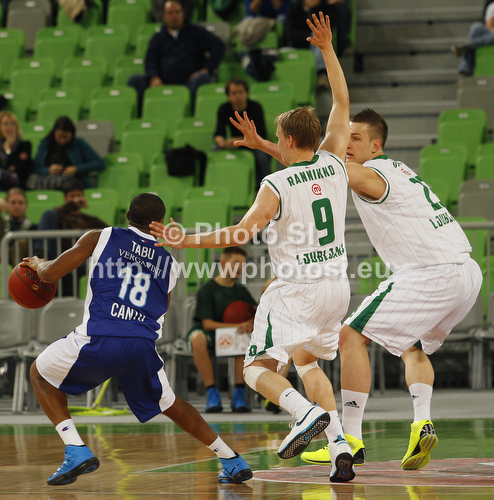 : Teemu Rannikko (no.9) of Union Olimpija (R) in defense against Jonathan Tabu (no.18) of Mapooro Cant (L) during Turkish Airlines Euroleague basketball match of sixth round between Union Olimpija, Ljubljana, Slovenia and Mapooro Cantu, Italy. Match between Union Olimpija and Mapooro Cantu was played in in Stozice Arena in Ljubljana, Slovenia, on Thursday, 15th of November 2012.
