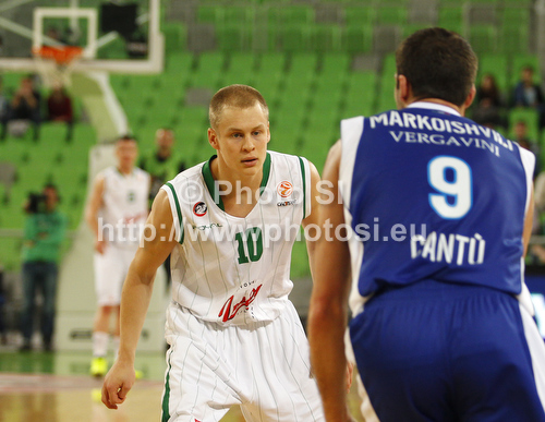 : Sasu Salin (no.10) of Union Olimpija (L) in defense against Manuchar Markoishvili (no.9) of Mapooro Cantu (R) during Turkish Airlines Euroleague basketball match of sixth round between Union Olimpija, Ljubljana, Slovenia and Mapooro Cantu, Italy. Match between Union Olimpija and Mapooro Cantu was played in in Stozice Arena in Ljubljana, Slovenia, on Thursday, 15th of November 2012.