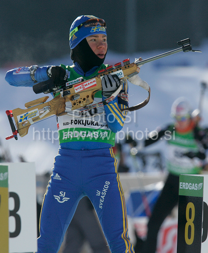 : Sofia Domeij of Sweden during women 10km pursuit race of e.on Ruhrgas IBU Biathlon World Cup 2009-10. Women pursuit race of e.on Ruhrgas IBU Biathlon World Cup was held in Pokljuka, Slovenia, on 20th of December 2009.