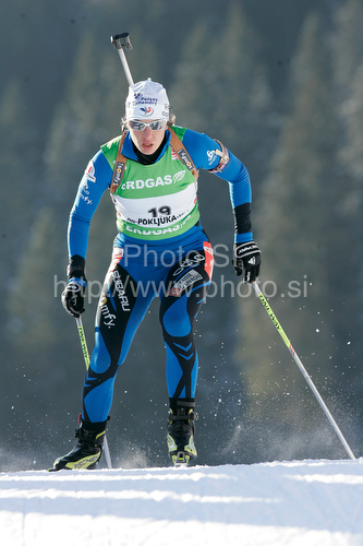: Julie Carraz Collin of France during women 10km pursuit race of e.on Ruhrgas IBU Biathlon World Cup 2009-10. Women pursuit race of e.on Ruhrgas IBU Biathlon World Cup was held in Pokljuka, Slovenia, on 20th of December 2009.